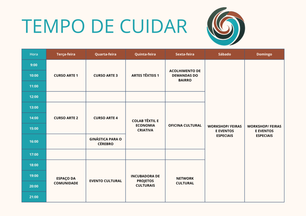 Bem-vinda à nossa vitrine de atividades! Este calendário é o coração pulsante do Tempo de Cuidar, onde você encontra toda a nossa programação de cursos fixos, oficinas criativas e eventos culturais no bairro Gaivotas. Cada bloco de cor representa uma oportunidade de aprendizado, convivência e autocuidado. Sinta-se à vontade para navegar pelos dias e clicar nos eventos para conhecer os detalhes de cada proposta, nossas mediadoras e como garantir a sua participação.